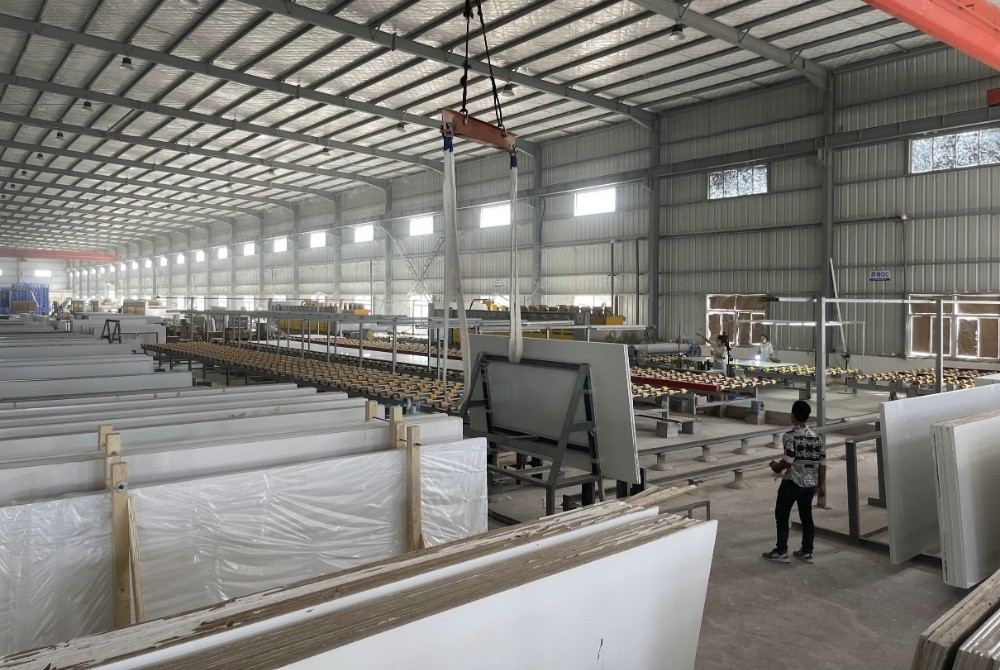 柬埔寨高金石有限公司是由福建磐珉新材有限公司于2019年11月在特區(qū)設立,主要生產(chǎn)可應用于住宅和商業(yè)室內(nèi)裝飾的環(huán)保石英石板材產(chǎn)品,包括廚房臺面、浴室臺面、辦公桌、墻板等,項目分二期建設,目前一期投資1000萬美元,建筑面積24000平方米,員工230人,年出口1800多萬美元;二期計劃擴建用地28000平方米。