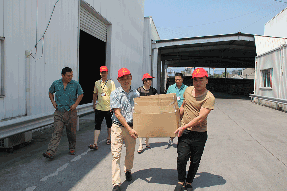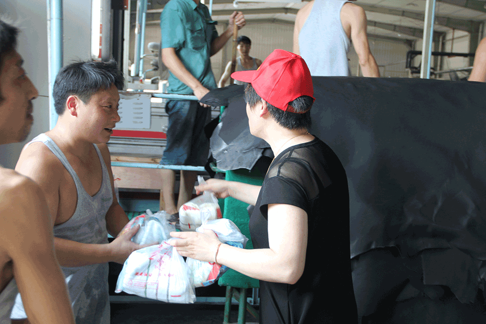 上午10時許,志愿者們兵分三路,帶著豆奶、毛巾、洗衣粉等用品,前往森德公司、海寧卡森公司和家值公司的繃板車間和真空車間,為一線忙碌的工人們送上了清涼用品,與他們親切握手,對高溫天氣中依然堅守崗位的一線員工表示感謝,感謝他們不辭炎熱和勞累,為公司生產積極奉獻。同時關切地要求他們注意身體健康和勞動安全,做好防暑降溫工作。