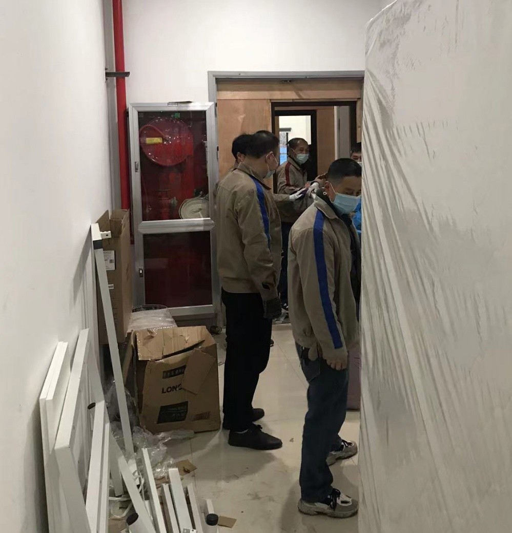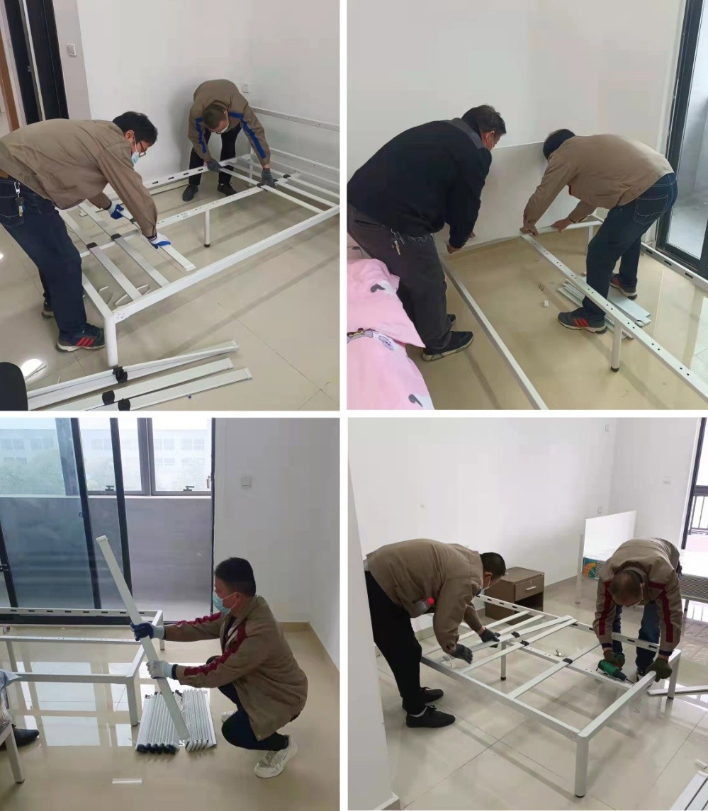 9點多,志愿者們到達第一個增援點,立即投入“戰斗”,先安裝兩個樓層的床位,之后立馬又調至第二個增援點,那里有十二個樓層,每層29個房間,志愿者們自己搬運床架組件,自己組裝,跑上跑下,爭分奪秒,為的是趕在隔離點人員到來之前全部安裝完畢。大家一刻不停,與時間賽跑,使勁趕進度。期間還安裝房間鋼架椅子,清理房間里的垃圾。