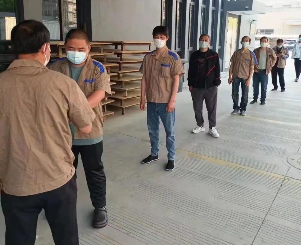 針對企業(yè)員工,定期配發(fā)口罩,要求每天戴口罩上班,由各部門負(fù)責(zé)人每天對員工的“嘉行碼”、行程記錄、核酸檢測情況進(jìn)行檢查;針對工作環(huán)境,各部門對車間、辦公室、食堂、衛(wèi)生間等公共區(qū)域每2天進(jìn)行消毒一次,餐廳就餐實(shí)行部門錯(cuò)時(shí)分4批就餐,地上標(biāo)1米外區(qū)間標(biāo)識(shí),有序排隊(duì)自帶餐盆就餐,桌上貼有標(biāo)識(shí),禁止互相聊天,提升文明安全等級(jí)。