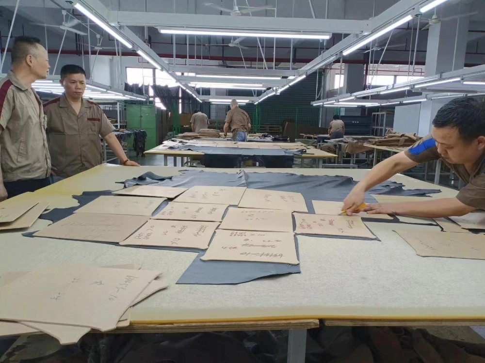 6月13日下午1時裁剪車間也進行了激烈比拼,8名一線員工較量63422-10皮1套的裁剪。比賽中選手把皮平攤在桌子上,認真地把皮疵點圈出,然后把樣板放皮上,嚴格按質(zhì)量要求認真裁皮。經(jīng)過激烈角逐,范國峰拿下了第一名。