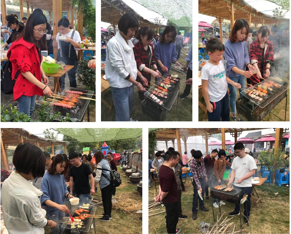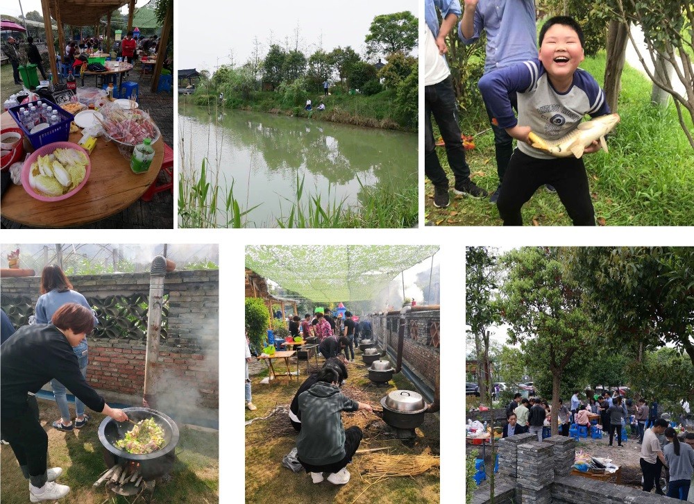 這次活動的地點是尖山金家農莊,那里景色秀麗,有蜿蜒的長廊,荷蘭風車,孩童玩的滑滑梯,共有大人小孩100多人參加了活動。喜歡釣魚的一大早趕到農莊,拿出自己的優良漁具占領有利地勢,拋出桿,開始享受釣魚的快樂。莊主家也早已經幫助準備好了食材,年長一點的員工都有燒飯的經驗,尤新仙、沈利仙、俞建強等組員負責燒野飯,在農家的土灶上,燒起了柴火,一個個大大的鐵鍋里,放上油,炒起了咸肉、春筍、蠶豆、豌豆、香腸,菜炒熟后放上米和水,隨著時間的推移,隨之而來的香噴噴的野飯味撲鼻而來;年輕一點的負責燒烤,大家分工明確,團結協作,雖然大家是新手,但是還是有不少人參加過燒烤活動,有一點點經驗的,在其中儼然就成了師傅,爭著做起了大師傅,把烤串刷上油、香料烤了起來,燒烤網上烤串放得滿滿的,引得旁人垂涎三尺紛紛投來羨慕和貪婪的眼光。每組烤的骨肉相連、羊肉串、雞翅等一一出爐,大家相互吆喝著請其他組人員來吃自己家烤的東西,紛紛夸贊自己組烤得好吃。烤的、吃的、串門的、看的、拍照的,每個人都樂在其中……