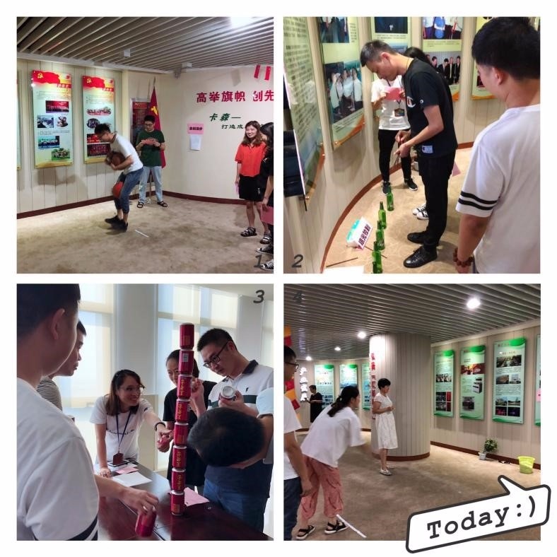 企鵝漫步其實是要求游戲者腋下夾兩個球,雙腿間再夾一個球,越過障礙走一個來回。看,我們小陸同學像不像一只企鵝。易拉罐積木是一正一反依次往上疊,果然高手在民間,瞧,我們葛經理竟疊起了8個,直叫人拍手叫好。其他項目也是一片熱鬧景象,現場一片歡聲笑語。